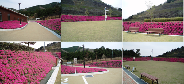 京都縦貫道 由良川パーキングエリアでは、芝桜が見頃を迎えています。